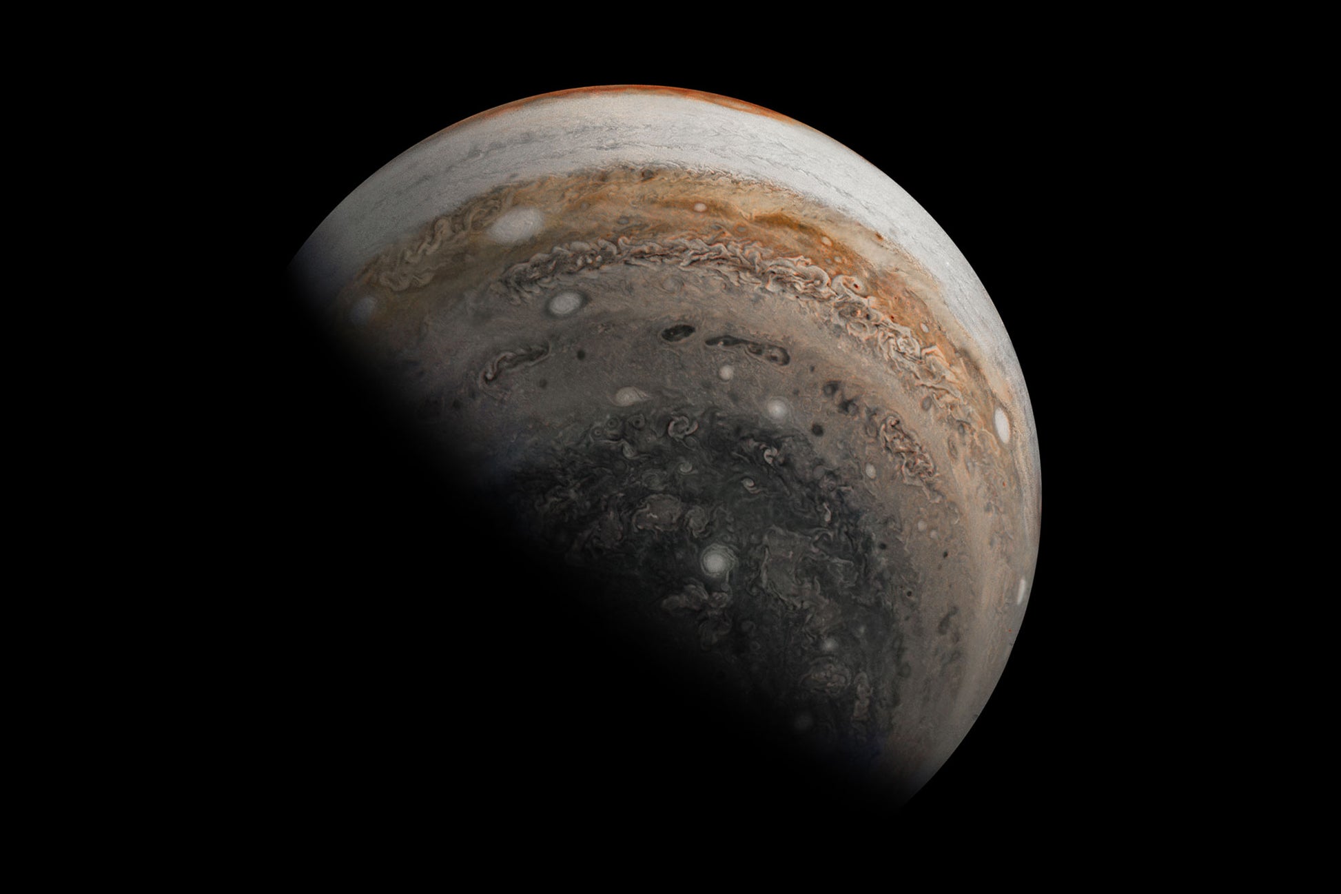 Just after its close flyby of Jupiter, NASA's Juno spacecraft caught this striking view of Jupiter's southern hemisphere as the spacecraft sped away from the giant planet. This image captures massive cyclones near Jupiter's south pole, as well as the chaotic clouds of the folded filamentary region — the turbulent area between the orange band and the brownish polar region.