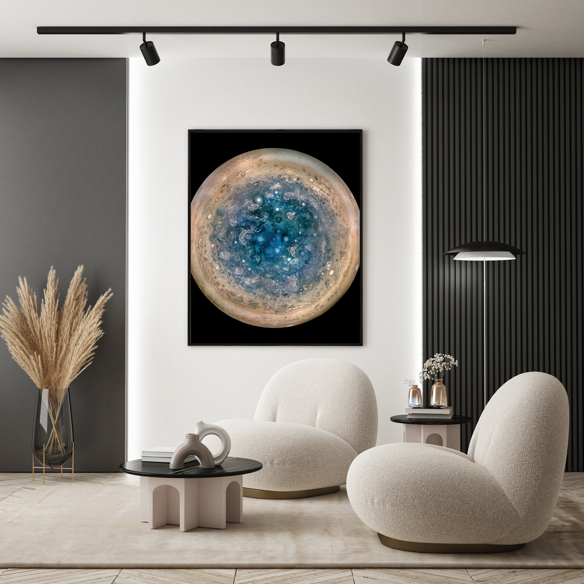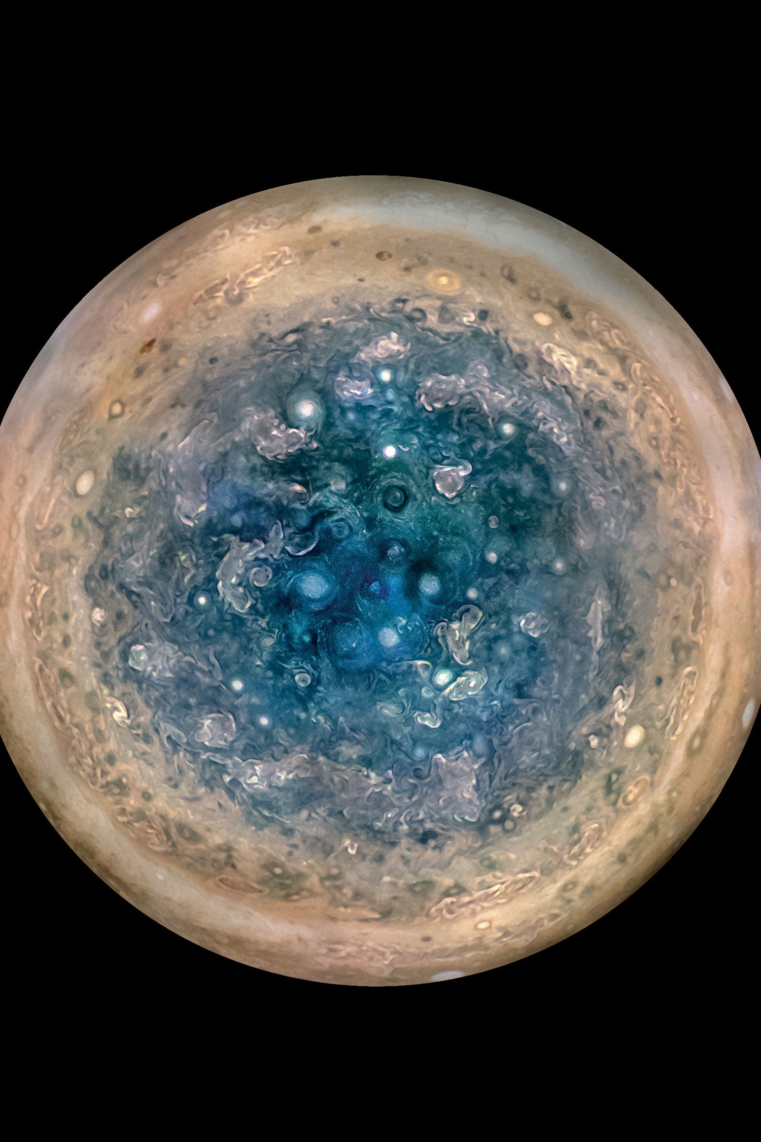 Dieses Bild zeigt Jupiters Südpol, wie er von der NASA-Raumsonde Juno aus einer Höhe von 52.000 Kilometern gesehen wird. Die ovalen Merkmale sind Zyklone mit einem Durchmesser von bis zu 1.000 Kilometern. Mehrere Bilder, die mit dem JunoCam-Instrument auf drei separaten Umlaufbahnen aufgenommen wurden, wurden kombiniert, um alle Bereiche bei Tageslicht, verbesserter Farbe und stereografischer Projektion zu zeigen.